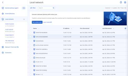 Device Sense™, Acronis’ technology for device discovery, uses a dual scanning system that includes continuous passive scanning and on-demand active scanning. The passive device discovery is enabled by default, with the number of Discovery agents per local network set to one. This Discovery agent is responsible for identifying and cataloging devices in the network.