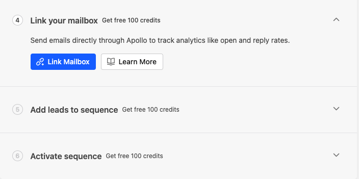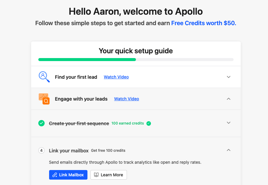 The on boarding process will launch automatically when you first sign up. Go through each phase to gain credits. Apollo has 250 million B2B leads in their database across 60 million companies, and keep the data up to date, so you shouldn’t receive a high percentage of email bounce-backs.