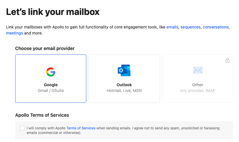 - Email Setup: Link your mailbox to Apollo.io and set up your email signature.