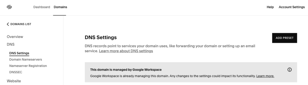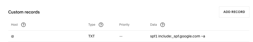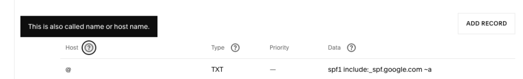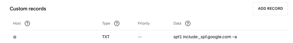 Note that when setting up the account in Google Workspace (Google sold their DNS hosting business to Squarespace), the SPF record was set up correctly at the outset.