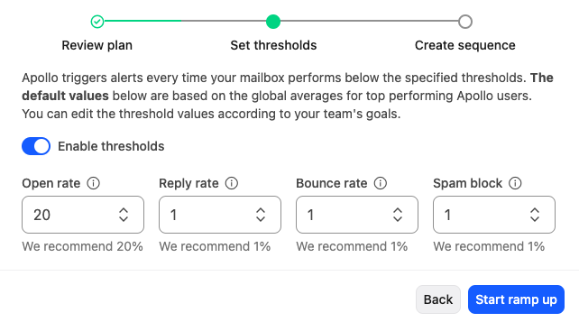 - Enable Ramp-Up: Users can enable the feature for their connected mailboxes in the Apollo dashboard.