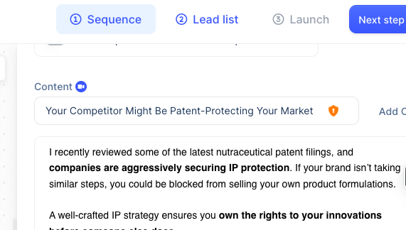 Write the message that will accompany your outbound connection request. In this case, we’re connecting as a patent attorney partner with nutraceutical CEOs, and we want to highlight our expertise in defending their intellectual property and show that we understand their industry.