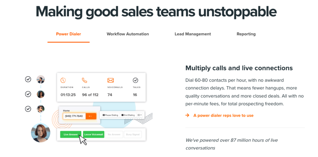 PhoneBurner’s key feature is its power dialer, which eliminates the time sales reps spend dialing numbers, waiting for calls to connect, or leaving voicemails. Instead, the software allows reps to automatically dial through lists, leaving pre-recorded voicemails and sending follow-up emails with a single click. Additionally, it integrates CRM functionality, so reps can manage contacts, track call outcomes, and organize follow-up actions all in one place.